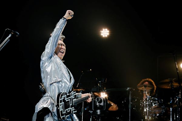 きらびやかなシルバーのセットアップに身を包んだ布袋。ビートに合わせて軽快に左足を上げてリズムを刻み、ギターをかき鳴らしながら歌う。満員御礼のオーディエンスも拳を高らかに大きな声で歌っている。オープニングナンバーからもう既に大団円のごとくの光景が広がった。「ハートは今ここにあるぜ!」と布袋がフレーズをオーディエンスに直接投げかけると、大合唱は一段と大きくなった。そのまま間髪入れずに「スリル」、「POISON」と90年代のヒットチューンを叩き込み、会場は興奮の坩堝と化した。布袋の両翼、右にはかつて布袋のギターに魅せられた少年だった黒田晃年(g)、左には布袋と同学年で同シーンを駆け抜けてきた井上富雄(b)が構える。後方には出会った頃は大学生、今や布袋の音楽に欠かせない存在の岸利至(prog)と、布袋に「俺のビートの一部」と言わしめ、今年還暦を迎える奥野真哉(key)という信頼の布陣。アンサンブルの土台、リズムを悠然と刻むのはデヴィッド・ボウイを通して出会い、国境を超えた布袋の盟友、ザッカリー・アルフォード(ds)である。