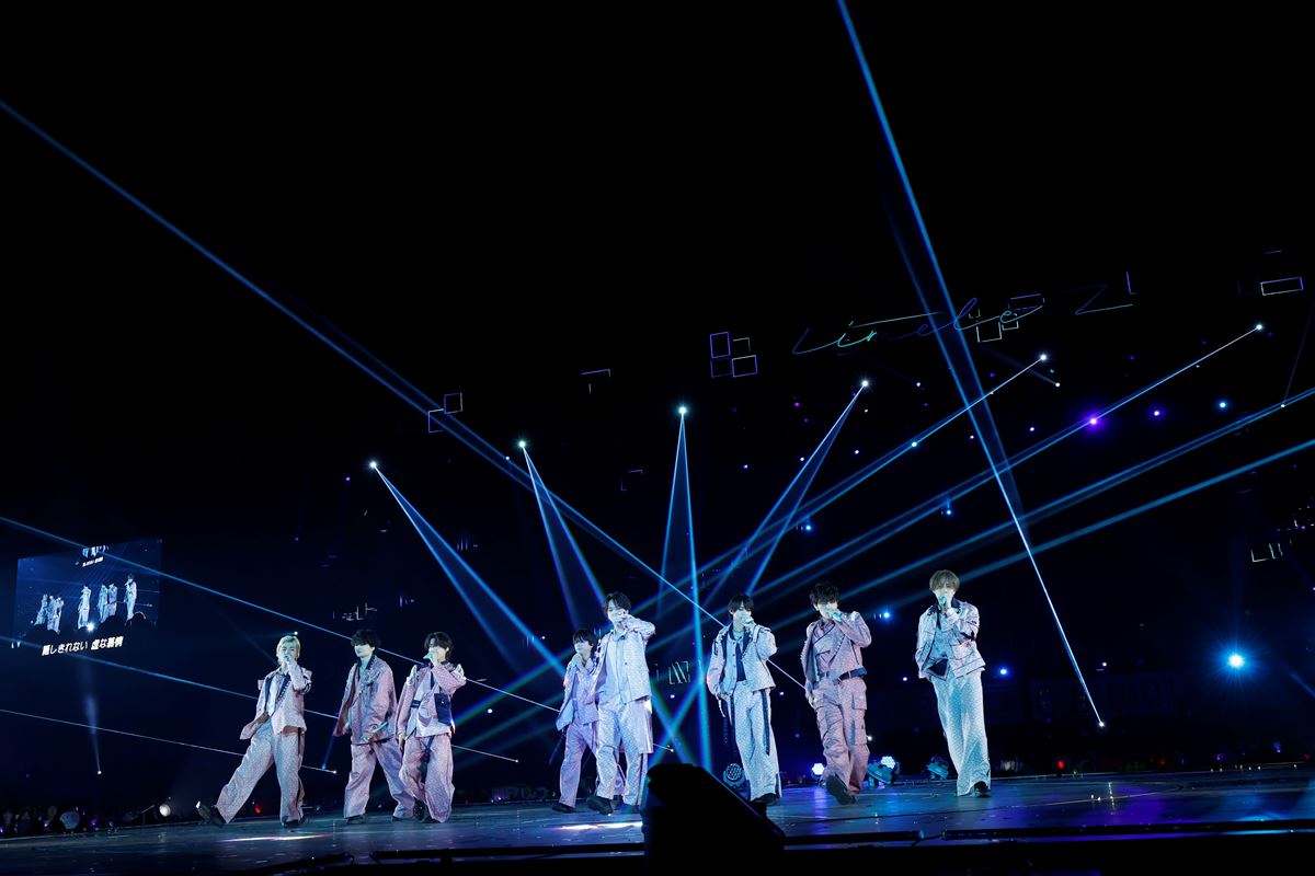ピンクと紺の衣装に着替え、パフォーマンスを再開。揺れるペンライトの海の中、外周ステージに立つそれぞれのメンバーがしっとりと歌い上げたのは『名脇役』。星屑がキラキラと光るリフターに乗って、上階のsecondzたちと目を合わせる。原の低く心地よい声からスタートした『かりそめの言葉』は8人が抱えてきた思いを込め、感情の高まりをそのまま伝えるような歌声で、会場の空気のその純度の高さに影響されてひとつになっていく。ライブには、観客に「自分が何者で、どんな問題を抱えて生きているのか」という現実を取り去り、ひとときの夢の中への没入を許してくれる力がある。その力を深く感じさせてくれるパフォーマンスだった。