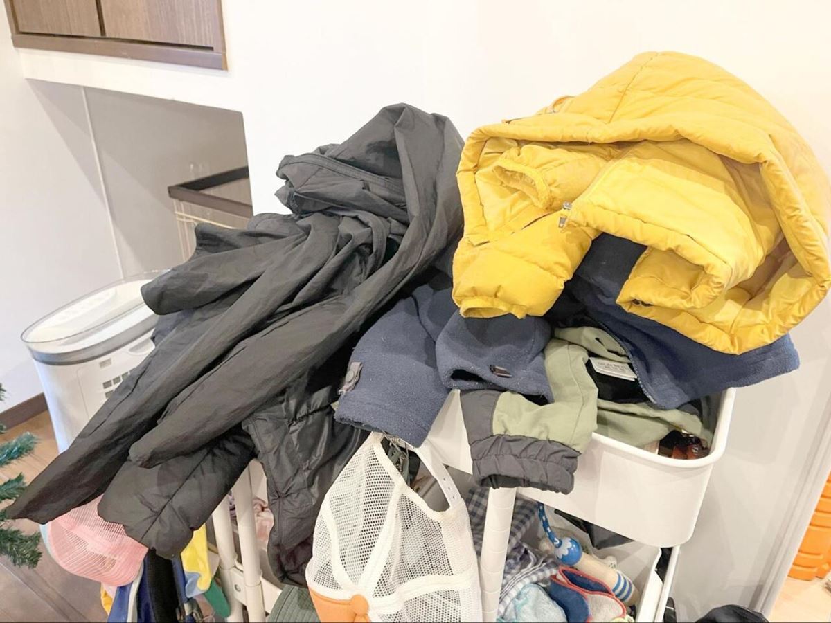 キャスター付きの収納ラックの上に脱ぎ捨てられ、気づけば毎年「アウターの山」が完成…。