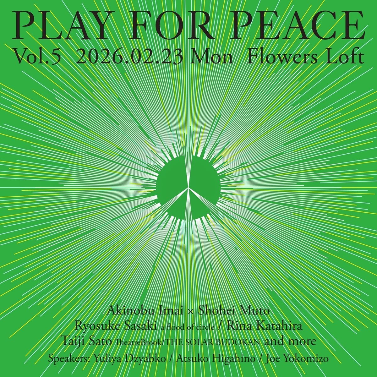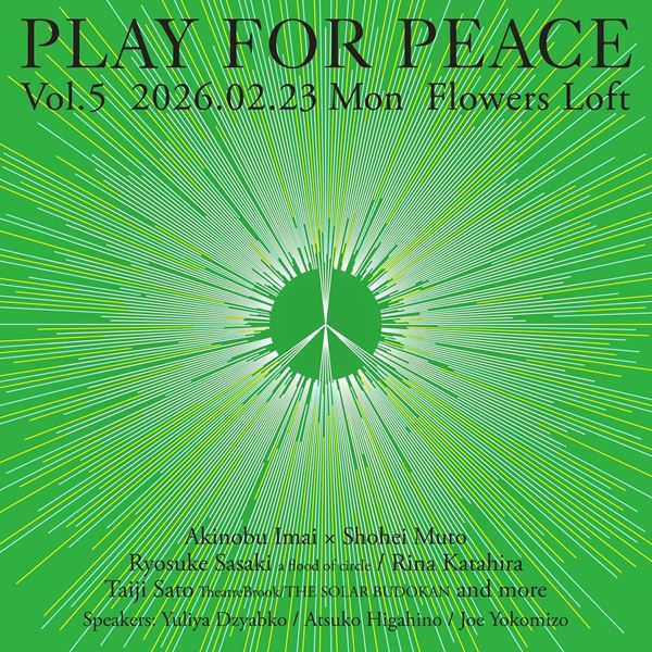 すべて見る2026年2月23日(月・祝)に、ウクライナ人道支援ライブ『PLAY FOR PEACE Vol.5』が開催され、イマイアキノブ×武藤昭平、サトウタイジ(Theatre Brook/THE SOLAR BUDOKAN)、佐々木亮介(a flood of circle)、片平里菜の出演が決定した。