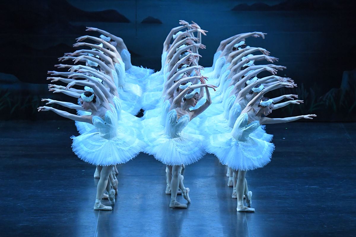 悪魔の呪いで白鳥の姿に変えられたオデット姫と、愛の力で彼女を救おうとするジーグフリード王子の物語。世界各地でさまざまな振付・演出が上演されてきたが、牧阿佐美バレヱ団は1980年以来テリー・ウエストモーランド演出・改訂による『白鳥の湖』を上演、プティパ/イワーノフの原振付を尊重した説得力ある舞台で観客を魅了してきた。現在上演されている芸術監督・三谷恭三の演出・改訂振付による舞台も、その荘厳で詩的な雰囲気を継承、バレエ団を代表する作品のひとつとしてファンの支持を得ている。美術を手がけたボブ・リングウッドは、映画『バットマン』の衣裳デザインを担ったことで知られ、英国で手がけた『海賊』でも話題を振りまいたアーティスト。どこか仄暗くて厳かな雰囲気をたたえた空間が、観客を一気に物語の世界へと引き込んでゆく。