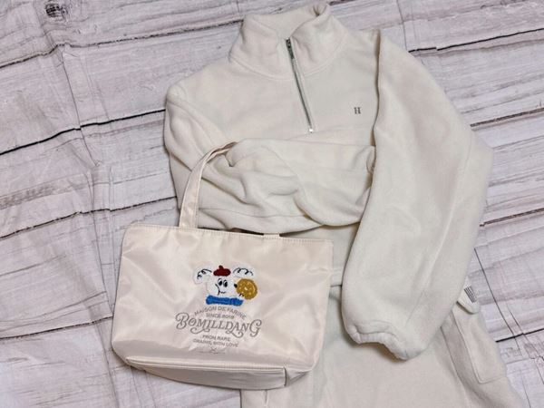 フロントには、BOMILLDANGのオリジナルキャラクターの刺繍入り。サガラ刺繍のもこもこ感がかわいらしく、デザインのアクセントになっています。