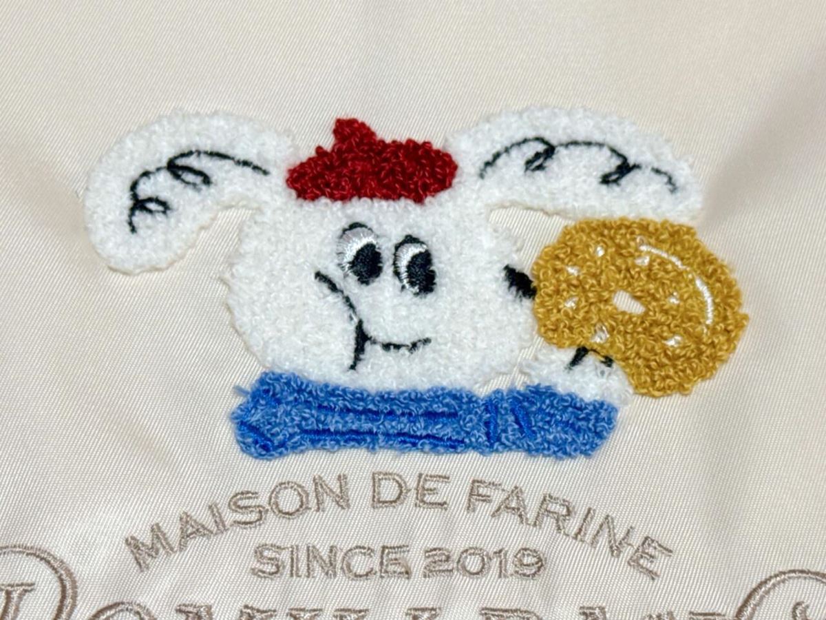 キャラクターの下には、ベージュカラーのかわいいフォントのロゴ刺繍入りなのもGood!