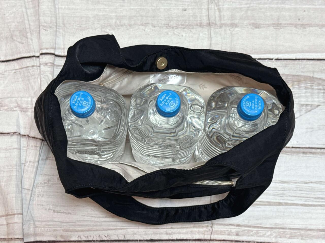 2Lのペットボトルが3本入る大容量サイズで、収納力は抜群。持ち手が長めなので、肩がけしやすいのもうれしいポイントです。