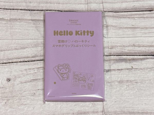 sweet3月号増刊の付録は、描き下ろしの雪焼けキティデザインのスマホグリップとぷっくりシールのセットという満足度の高い豪華アイテム。
