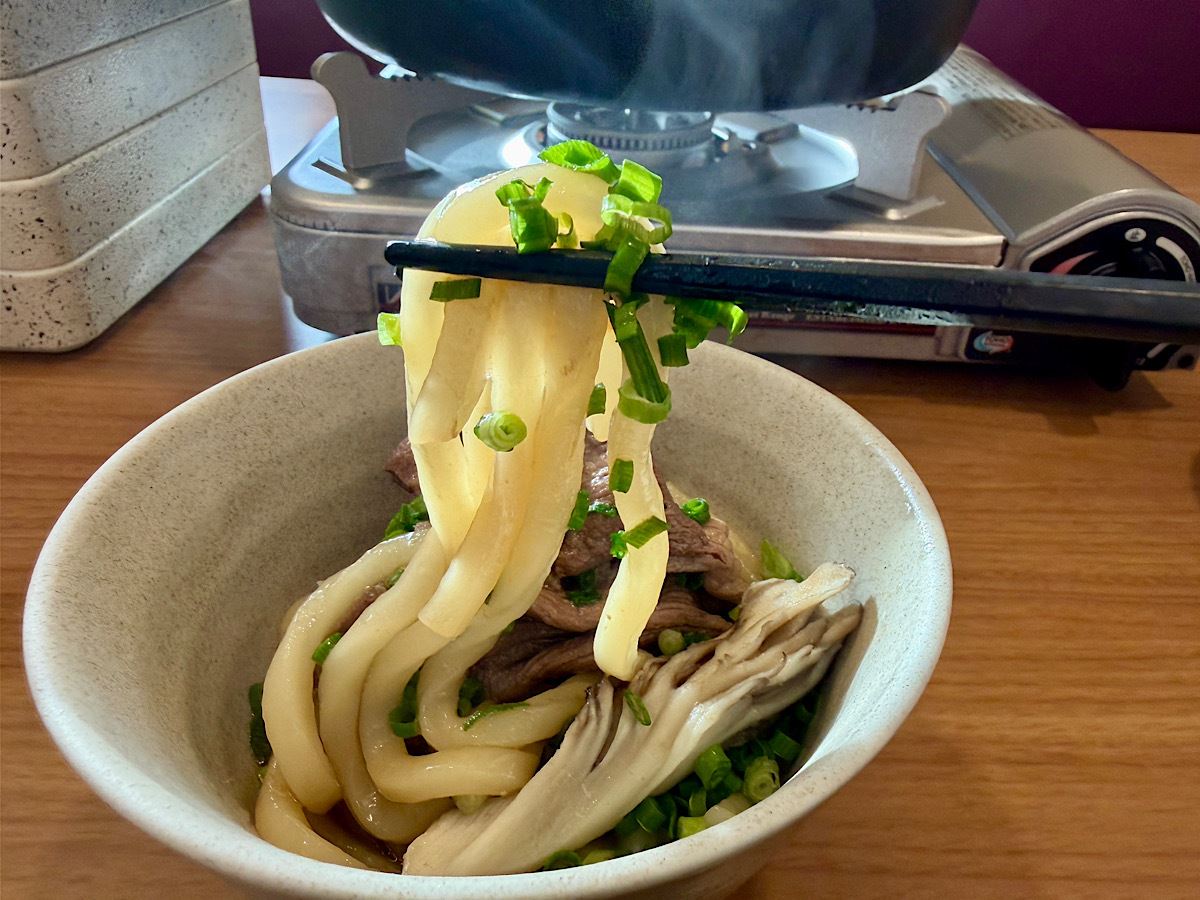 今回選んだすき焼きだしは、メニューでも締めはうどんがおすすめと案内されていたので、締めの麺はうどんをチョイス。少し残しておいた牛肉と舞茸、薬味のネギを加えて、だしが染みるまでぐつぐつ煮込んでいきます。