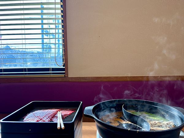 【夢庵 牛・豚コース】鶏肉、つくね、野菜に火が通るまで待つ間に、牛カルビ、牛肉をすき焼きだしでしゃぶしゃぶします