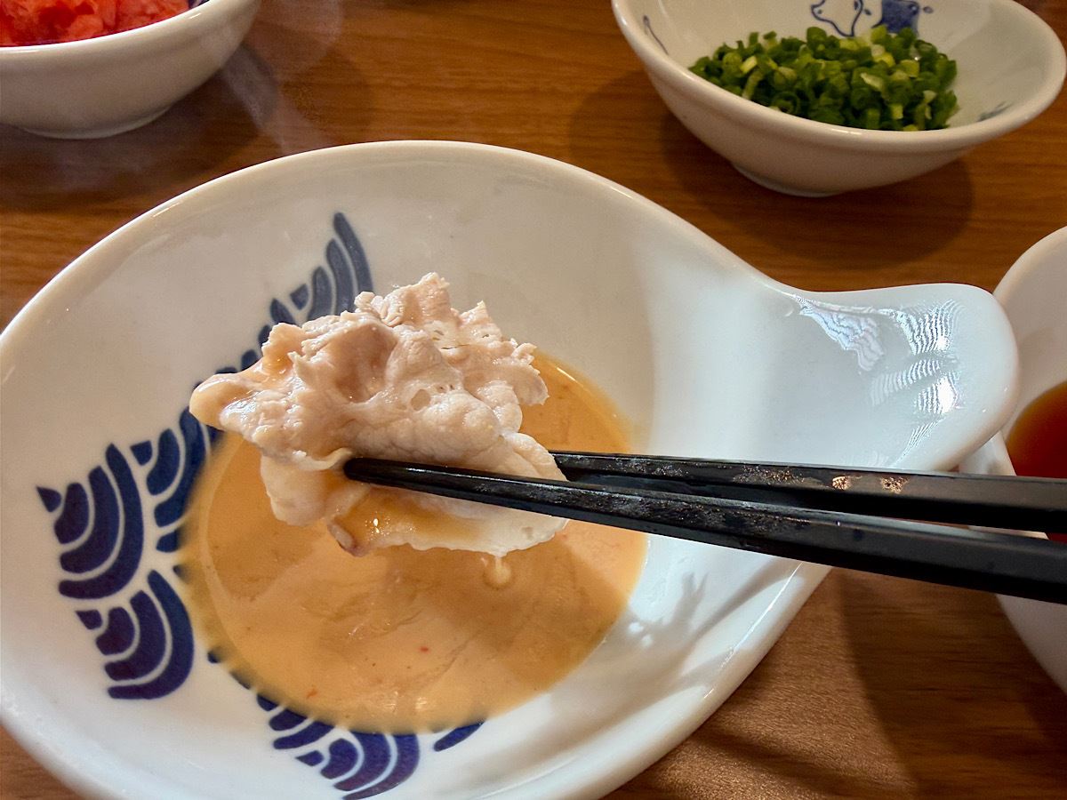 豚肉は脂と赤身のバランスがよく、クセがないのでどんなお出汁にも合いそうなお味。箸休めにも主役にも回れる万能選手の立ち位置ですね。タレや薬味で自分好みにアレンジするのに向いているので、筆者はごまだれをつけていただきました♪