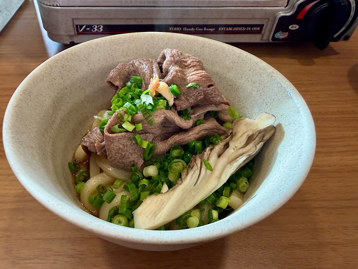 煮込んだうどんはすき焼きだしの甘辛さと牛の旨みを吸い込み、だしの味をじんわり楽しめました。舞茸の香りとネギの軽い辛味が後味を引き締めてくれるので、ボリュームがありながらも重くなりすぎず、きれいに締まる一杯を味わい尽くしました。