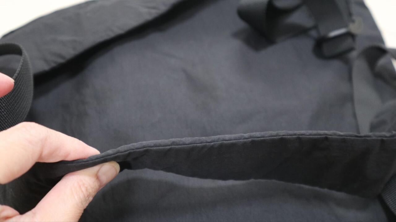 表地は綿とナイロンの混紡で肌あたりが柔らかく、ギャザーが美しく出る素材感。裏地のポリエステルもなめらかです。肩ベルトは薄めの設計で、手持ちや収納時にも邪魔になりません♪