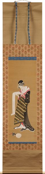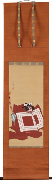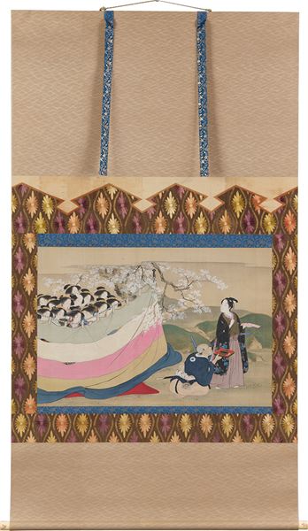 「表装」とは、絵画や書の保存・鑑賞のために、裂地や紙を用いて掛け軸や巻物に仕立てることをいう。展覧会で解説されたり図録に掲載されることはほとんどないが、作品を補強、引き立たせるという重要な役割を持っている。同展では、表装文化の研究者・濱村繭衣子氏の監修により、勝川春章《桜下詠歌の図》や喜多川歌麿《美人読玉章図》、葛飾北斎《源氏物語図》といった館が誇る肉筆浮世絵を楽しみながら、それらを飾る表装の鑑賞ポイントを紹介する。