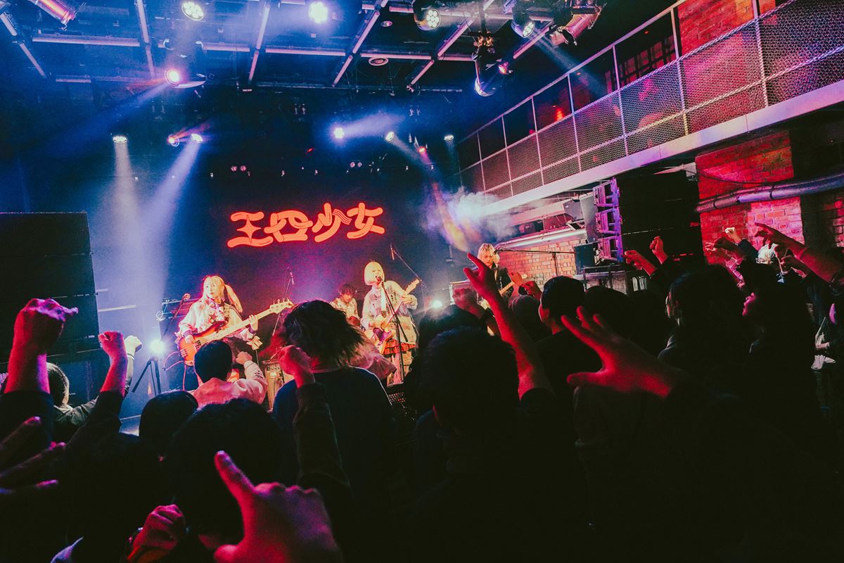 次に登場したのが大阪発のネオキューティーロックバンド・三四少女だ。本イベントの大阪編と東京編に連続出演した三四少女は、今年4月にはワーナーミュージック・ジャパンよりメジャーデビューが決定。今、まさに熱視線を注がれているバンドだ。大きな拍手に迎えられ、まずは「Stop!Drop!Roll!!」からライブをスタート。飄々とした立ち姿から放たれるのはソリッドで力強いリフからなるロックナンバーで破壊力も十分。川田羽撫子(vo/g)の呟くような歌声、禍々しい間奏、キャッチーではないかもしれないが、その飛び抜け方はとてもポップ。川田が置いたステージドリンクがコーラというのも度肝を抜かれたが、何か引っかかる、気になる要素も満載なのだ。