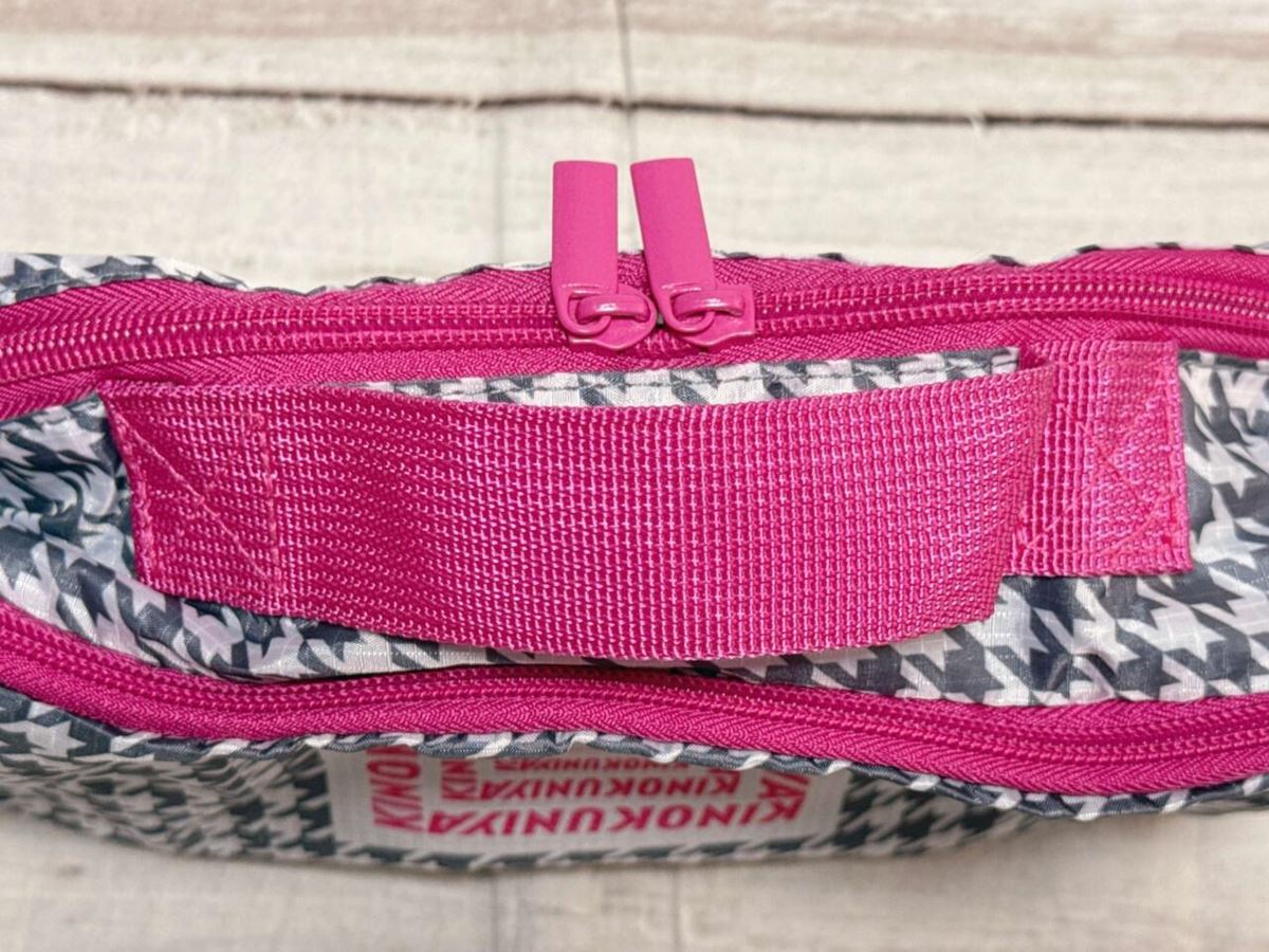 セブン限定デザインは、グレー×ホワイトの千鳥格子柄に、ビビッドピンクの持ち手とファスナーが映えるおしゃれな配色。