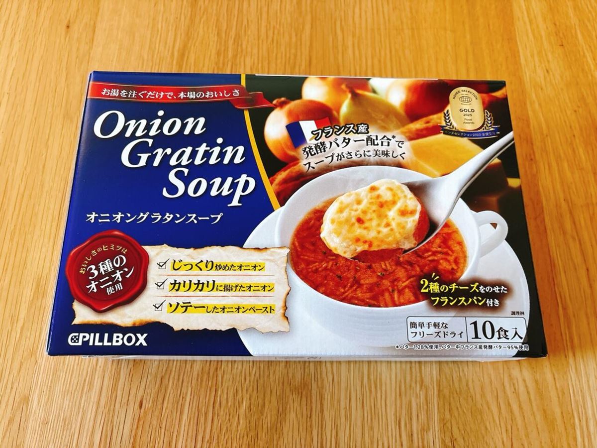 まず最初にご紹介するのは、コストコファンの間ではもはや伝説級の定番商品、ピルボックスの「オニオングラタンスープ」です。