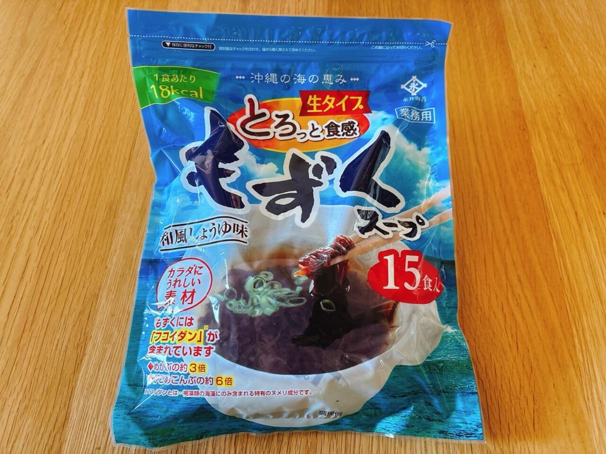 このスープの特徴は、乾燥具材ではなく「生タイプ(レトルト)」の沖縄県産もずくを使用している点です。