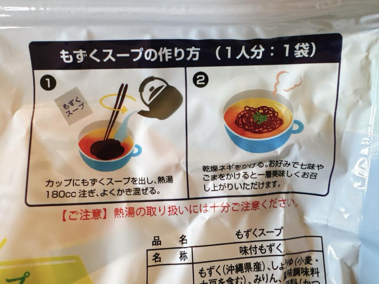 ・作り方: もずくスープ(レトルトパック)を入れ、熱湯180mlを注ぐ