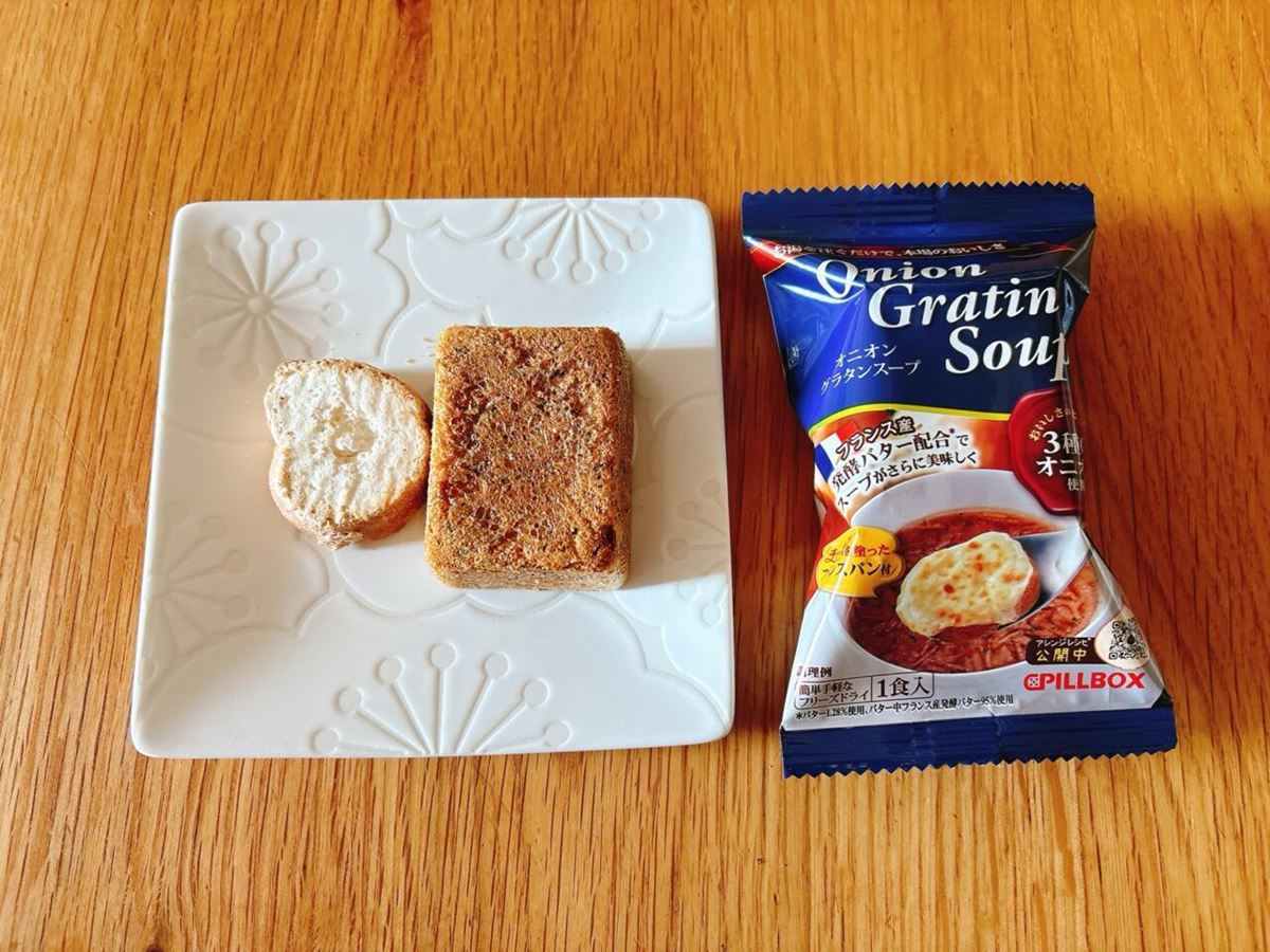 【コストコ ピルボックス オニオングラタンスープ】個包装の中にはフリーズドライのスープとフランスパンが入っています