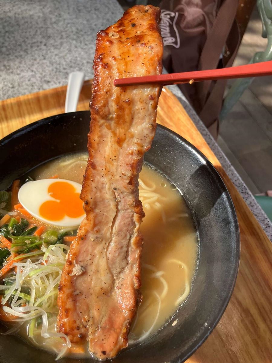 箸で持ち上げてみると、すごいサイズ…!! ディズニーでこんなド迫力のチャーシューに出会えるとは…!