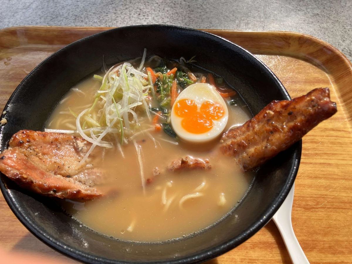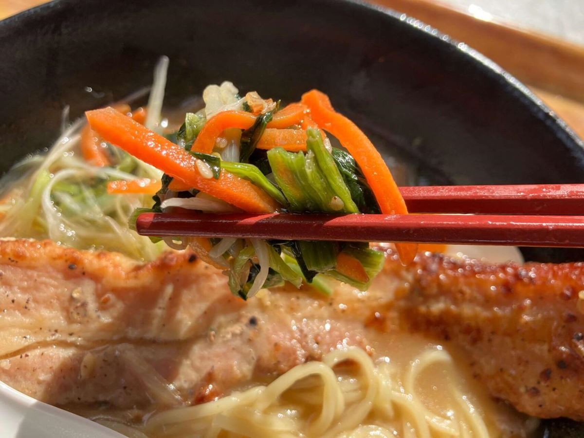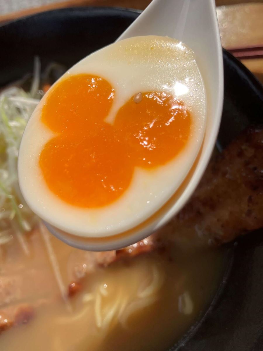 黄身がミッキー型になった可愛すぎる半熟卵や、見た目より気前の良い量がうれしい茹で野菜(にんじん、ほうれん草、もやし)と、ねぎというトッピングのラインナップも抜かりなし。