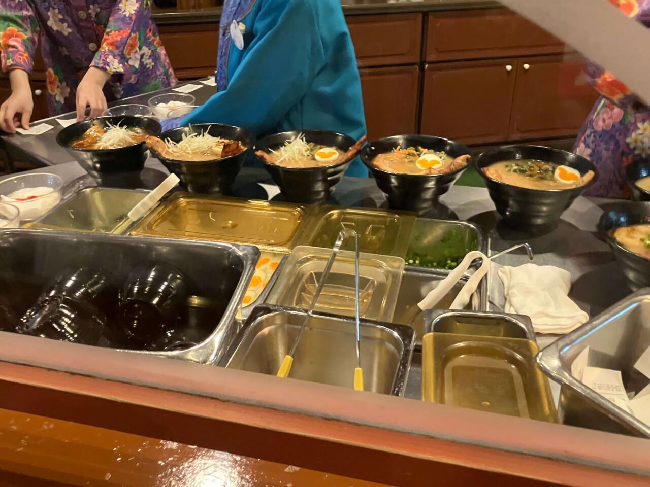 さらに列を進むと調理風景が見えるオープンキッチンがあり、みるみる速さで次々とラーメンが出来上がっていきます。スープのいい匂いが漂い、あ~お腹が空く…!