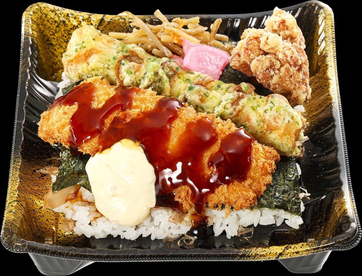 「特製」というだけあって豪華!鶏唐揚げにちくわの磯辺揚げ、コロッケ、きんぴらごぼう、ウインナー、焼きそば、漬物がご飯の上に敷き詰められています。