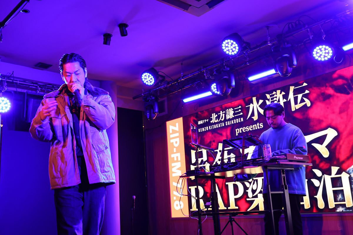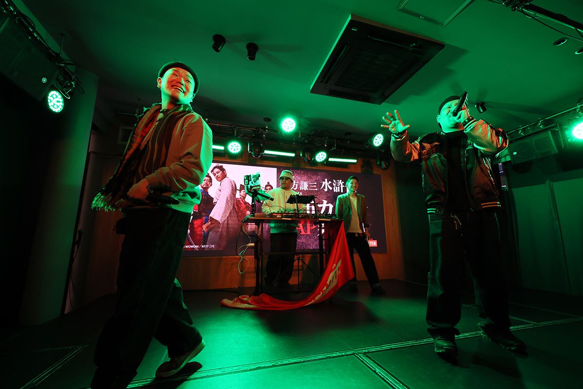 後半は、ZIP-FMで番組を持つ呂布とDJ鷹の目、そしてナビゲーターの町田によるライブ&トークセッションを展開。第1話を視聴した呂布は、「全編通してスケールが壮大でした。僕の名前も三国志から取っているので、親近感を抱きながら食い入るように観てました」とコメント。さらに、「僕たちの仲間も、このドラマのように、はみ出し者が自然に集まっている。世の中を変えていこうとすることは、ラッパーがやっていることに近いのかもしれない」と語り、ドラマとヒップホップカルチャーの共鳴を示唆した。ライブでは「水滸伝 SPECIAL VERSION」を披露。圧倒的なリリックと存在感で会場を掌握し、歌詞に刻まれた「集結せよ!」のフレーズに観客も呼応した。