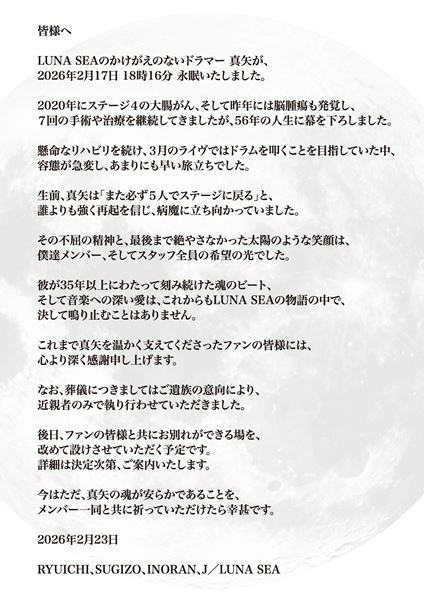LUNA SEAのかけがえのないドラマー 真矢が、2026年2月17日 18時16分 永眠いたしました。
