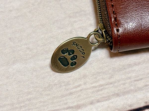 ファスナーの引き手にはチャーム付きで、スヌーピーの肉球の刻印が入っています。カラーはアンティークゴールドで大人っぽく、ここがまた高見えポイント。開け閉めするたびに気分が上がります。