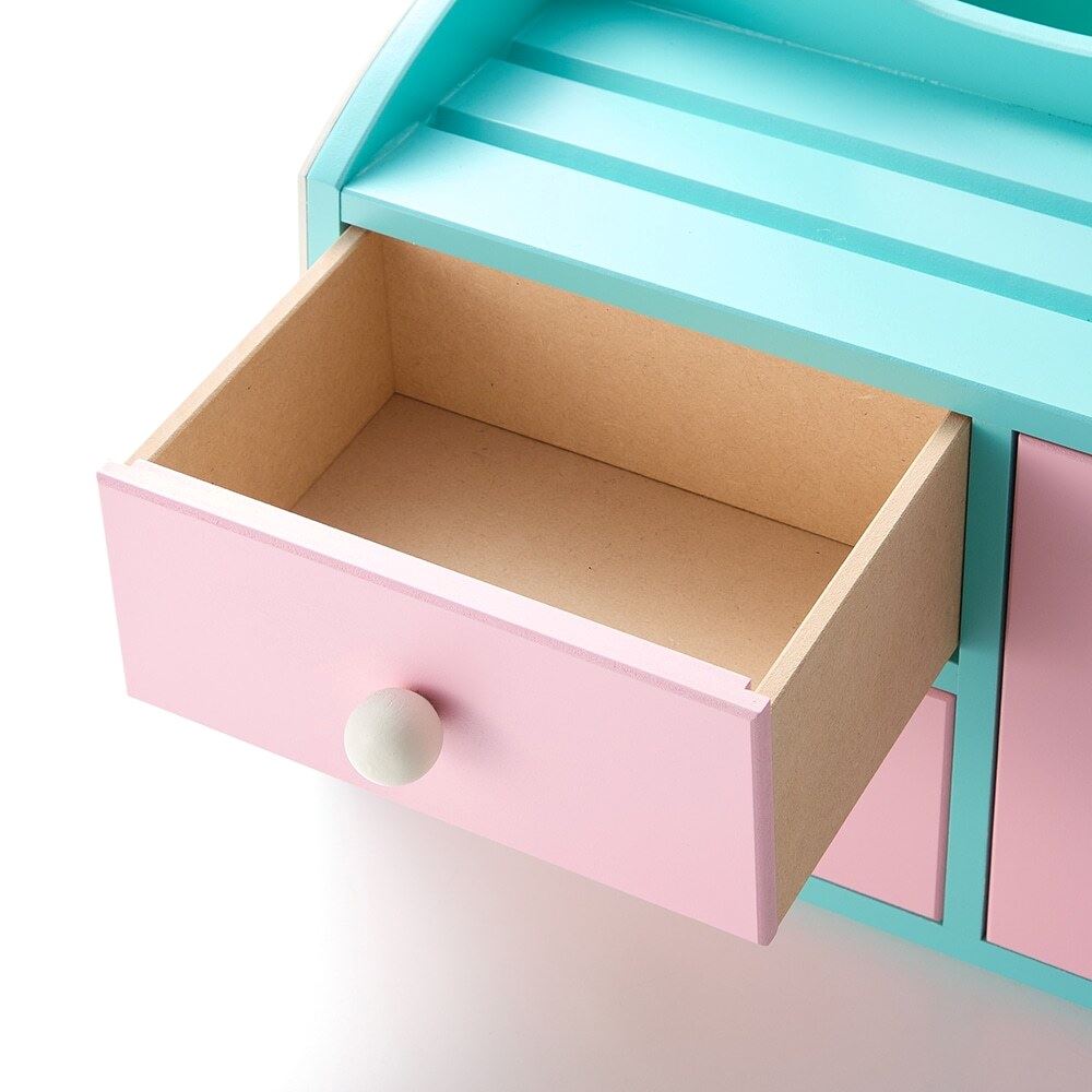 前面に3杯の引出しがついており、手持ちのメイク道具をたっぷりしまえる仕様に。