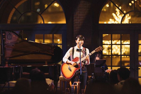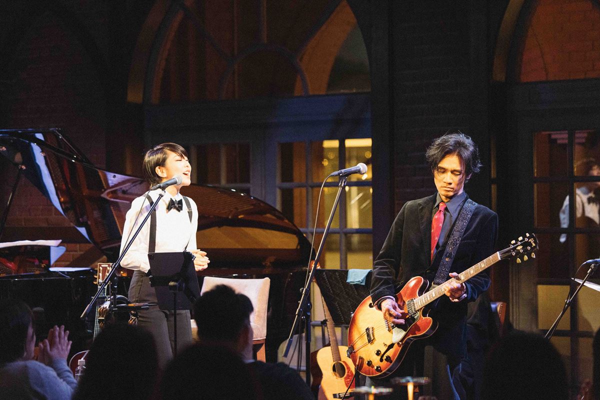 ステージ後方より、黒い蝶ネクタイにサスペンダーをしたパンツスタイルで登場したリトルブラックドレス。 丁寧にギターを持ち上げると、「今日は楽しんで行ってください」と客席に笑顔を向け、竹内まりやの「プラスティック・ラブ」でムーディーにスタートした。一曲歌い終えると「CITY POP NIGHT Songs by Mariya Takeuchi、最後まで楽しんで行ってください」と話し、「OH NO,OH YES!」 へと続く。この日、リトルブラックドレスのボーカルに寄り添うサウンドを作り上げるのはSam Pomanti(key)、岡聡志(g)、番田渚奈子(ds&perc)。全曲アコースティックなバンドセッションにて、「マージービートで唄わせて」「シングル・アゲイン」「駅」「雨のドライブ」と名曲の数々をパフォーマンスした。