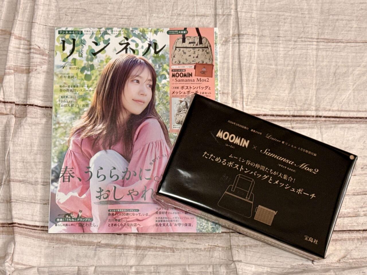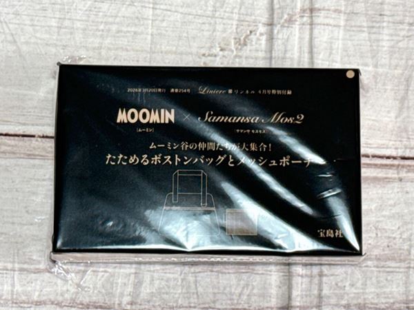 2026年2月19日(木)発売の雑誌『リンネル』4月号には、MOOMIN×Samansa Mos2(ムーミン × サマンサ モスモス)の「ボストンバッグとメッシュポーチ 2点セット」が付録として登場します。