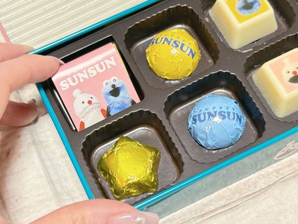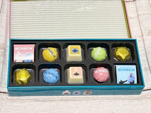 中身は、キャラクターがプリントされたホワイトチョコが主役!スンスンのアートプリント入りの紙や、ロゴ入り銀紙に包まれたチョコなど豪華な10個入りで、食べるのがもったいなくなるクオリティです。