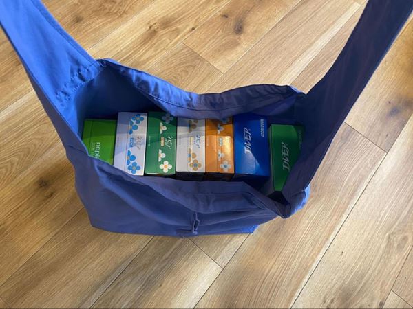 容量は薄型のボックスティッシュを縦に7つ入れてもまだ余裕がある程度。バッグの口にはヒモが付いていて、縛って閉じることができる仕様です。