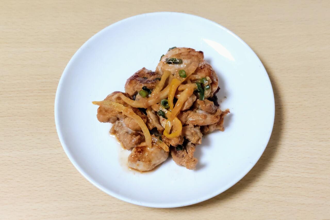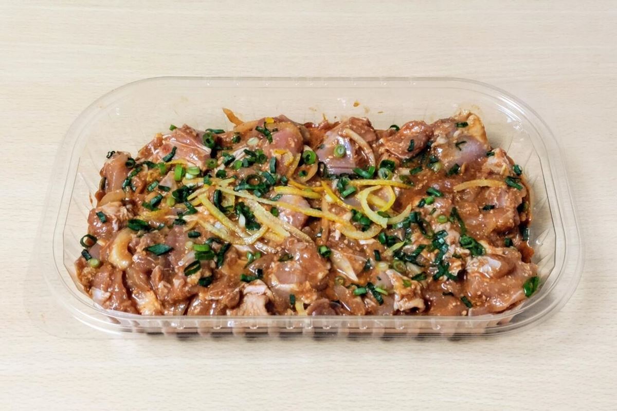 本品は国産の鶏もも肉を山椒味噌ダレで味付けしたもの。そのほかの具材としてタマネギ、柚子、青ネギも入っています。