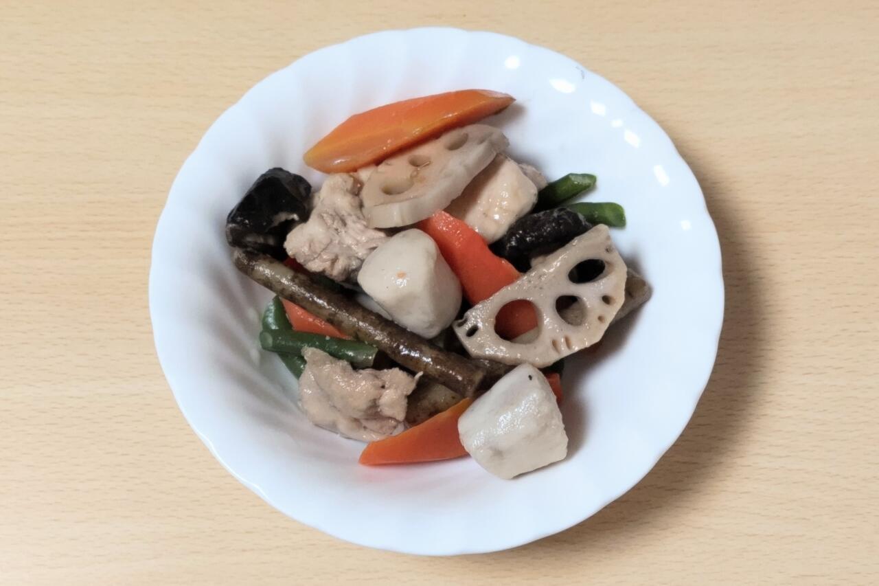 食材は、ゴボウ、サトイモ、鶏肉、シイタケ、ニンジン、レンコン、インゲンの7種類。一つひとつが大きめなので、各食材の風味や食感をしっかり楽しめますね。