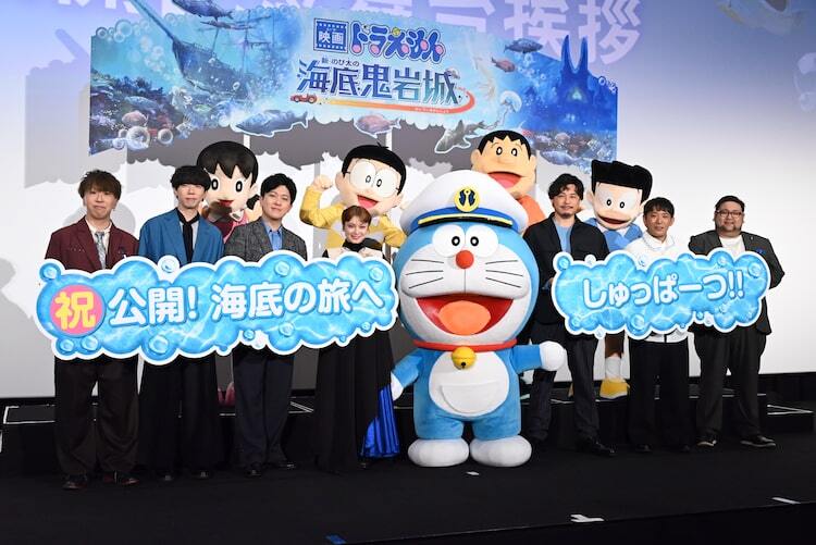 「映画ドラえもん 新・のび太の海底鬼岩城」の公開記念舞台挨拶が、本日2月28日に東京・TOHOシネマズ 六本木ヒルズで開催。宣伝アンバサダー兼ゲスト声優の平愛梨、アルコ&ピース・平子祐希と酒井健太、主題歌を担当したsumikaの片岡健太(Vo, G)、荒井智之(Dr)、小川貴之(Key, Cho)、ドラえもん、のび太、しずか、ジャイアン、スネ夫、監督の矢嶋哲生が登壇した。