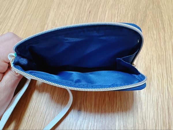 メインのファスナー部分はガバッと大きく開くため、中身の確認もスムーズ。小銭だけでなく、目薬やリップ、常備薬といった細々したアイテムも収納可能です。
