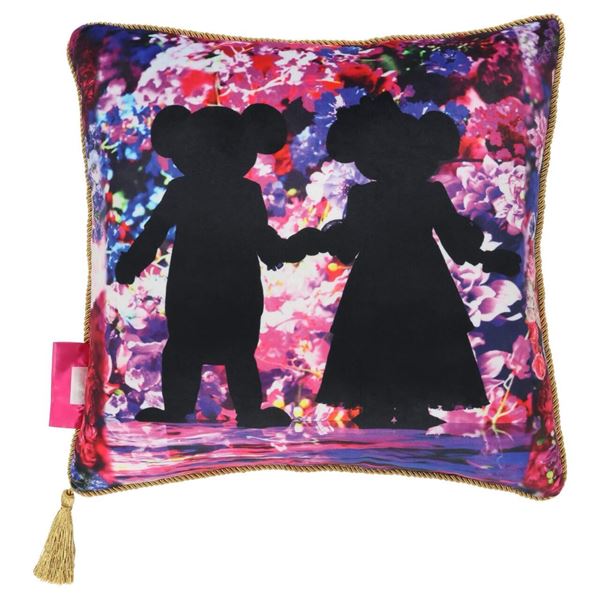 クッションは、ミッキーとミニーがファンタジースプリングスのコスチュームを着た様子を写真に収めたデザイン。