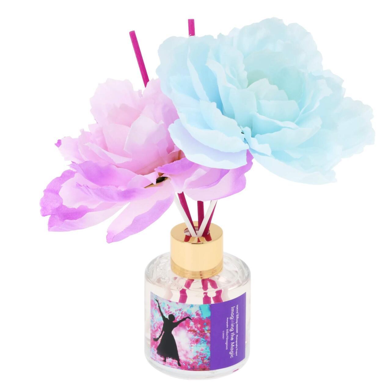フレグランスのお花とお揃いのピンクとブルーのお花をバックに、ラプンツェルが好奇心いっぱいの様子です。