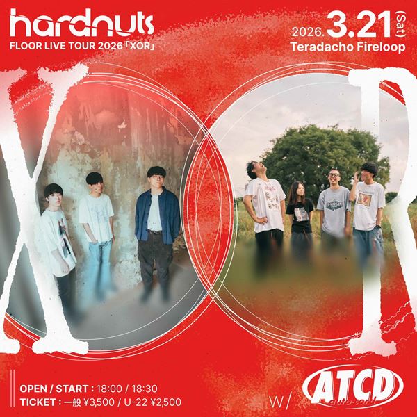 また、全公演フロアライブとなる『hardnuts floor live tour 2026「XOR」』の開催も決定。 3月21日(土) 大阪・寺田町Fireloop公演にオートコード、3月28日(土) 愛知・名古屋stiffslack公演にQOOPIE、ファイナルとなる4月18日(土) 東京・吉祥寺WARP公演に國を迎え、全公演ツーマン形式で開催される。