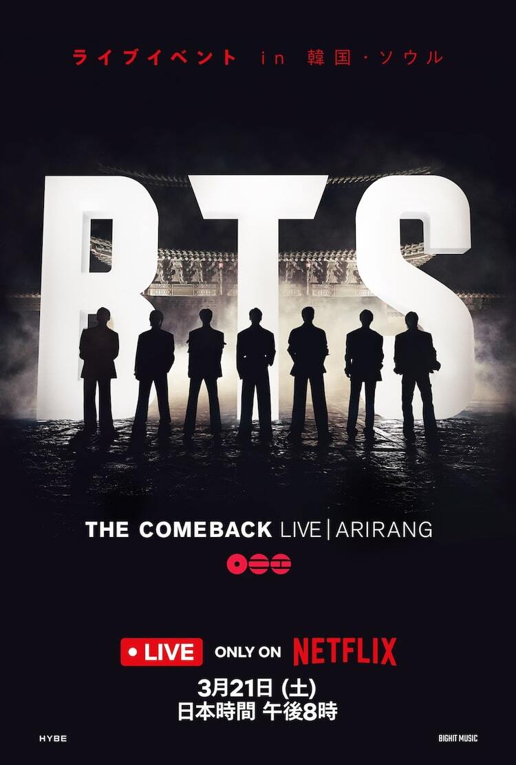 BTSの復帰公演を生中継する「BTS THE COMEBACK LIVE | ARIRANG」が、日本時間3月21日20時からNetflixで世界独占ライブ配信決定。映画「BTS: THE RETURN」も3月27日に独占配信される。このたび、キーアートと予告編が解禁された。