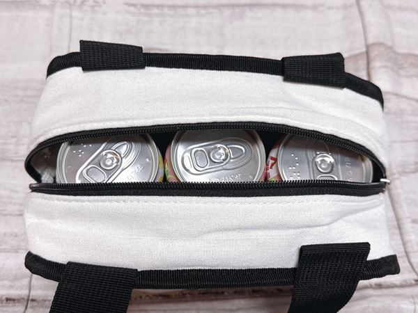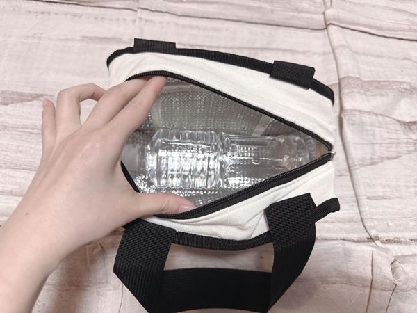 セットのオリジナルバッグの中に収まるサイズ。550mLのペットボトルを横に倒して収納できる幅で、高さは350mLの缶がぴったり入るサイズ。350mLの缶は3本収納できました!