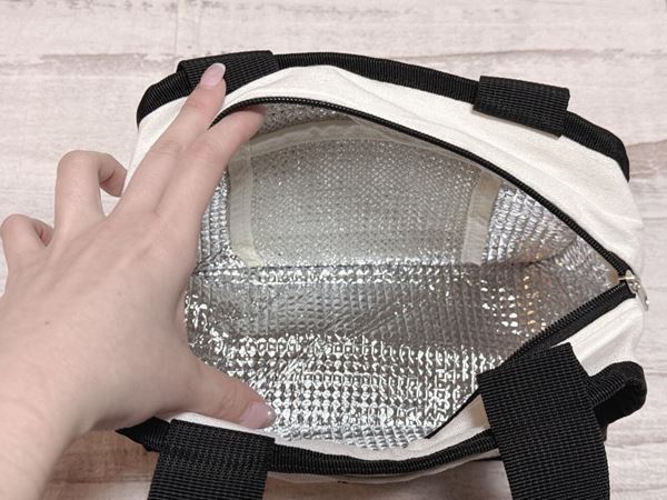 内側には保冷機能付きの裏地が使用されており、メッシュポケットも付いているため保冷剤を収納できます。
