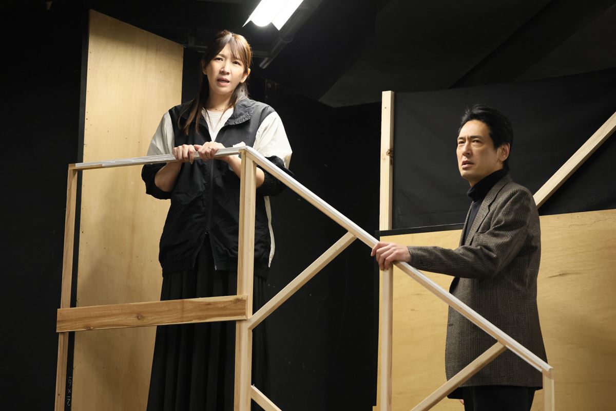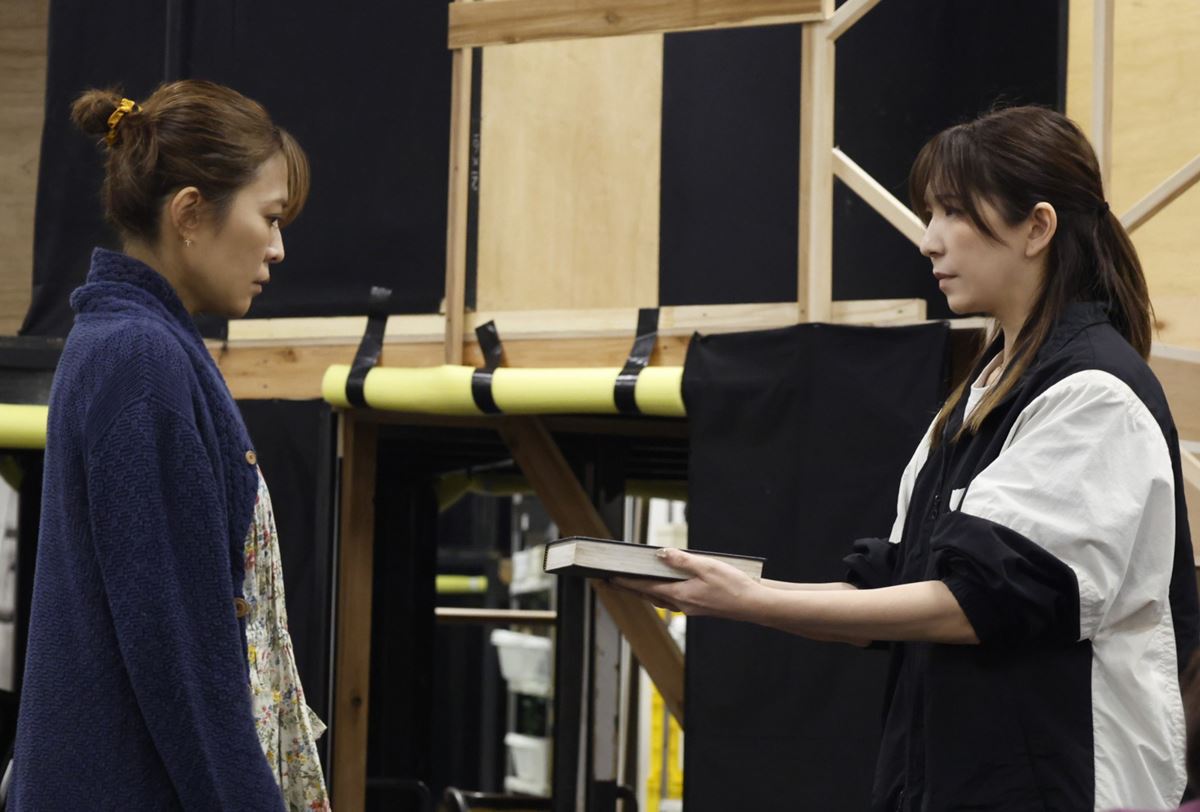 稽古場には、仮のセットが組まれている。舞台中央にミセス・ジョンストン(安蘭けい)が、続いてブリッジにナレーター(東山義久)が現れ、彼女が生んだ双子の運命を語り始めるのだ。