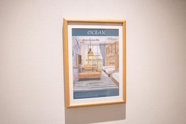 「オーシャン」は大きなジンベエザメが描かれた壁紙に、船のようなベッドが2段で並び、6名まで宿泊が可能です。