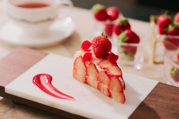 その後、「La Jyho Terrace」に移動し、ビュッフェがスタート。まず繊細にスライスされたいちごの断面が美しいウェルカムデセール「こだわりいちごショート」が用意されます。