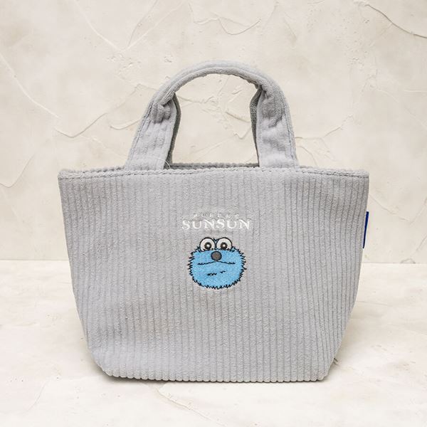 「コーデュロイ生地ランチバッグ」は落ち着いたグレーの生地にスンスンの顔が刺繍された、大人っぽい仕上がり!