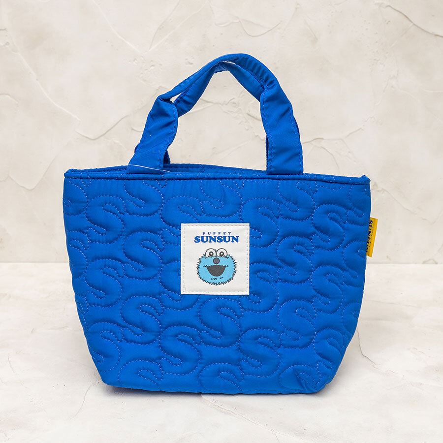 「キルティング生地ランチバッグ」は、スンスンカラーの鮮やかなブルーが目を引く一品。「S」の字のステッチと、スンスンのワッペンがポップでかわいらしいデザインです♪