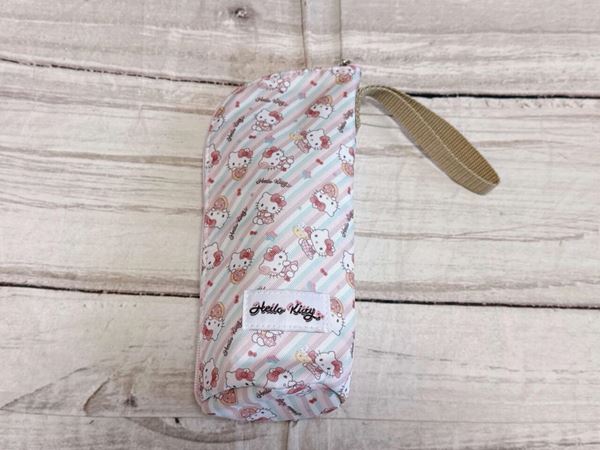 ペットボトルホルダーは、パステルカラーのストライプとキティちゃんの総柄デザインが魅力。保冷機能付きで、これからの季節のお出かけや通勤・通学にも活躍してくれそうです。