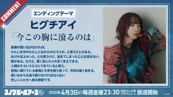 あのヒグチアイさんにエンディングテーマを彩っていただける喜びを、深く噛み締めています。初めて楽曲を聴かせていただいた時、凍てついた星で懸命に生きる人々の強さと弱さ、そして人間をまるごと肯定してくれるような熱い優しさを感じました。聴くだけで魂が鼓舞される、素敵な一曲です!